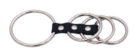 Сбруя на фаллос и мошонку из четырех массивных металлических колец, сопряженных вместе ремешком. Отличный аксессуар для истинных любителей фетиша.