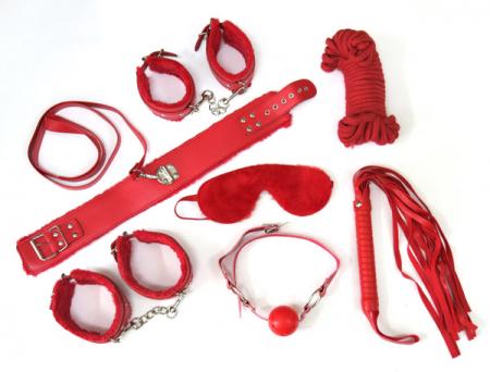 Эффектный красный фетиш-набор для любовных игр из 7 предметов: маска на глаза, плетка, наручники, ошейник, кандалы, кляп, веревка для связывания. Идеальный набор для любителей острых ощущений!