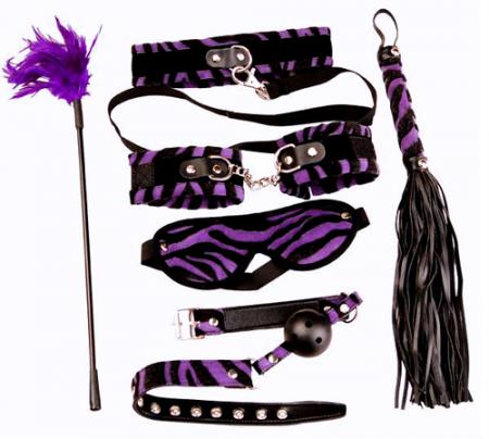 Фетиш-набор для любовных игр из 6 предметов: маска на глаза, ошейник с поводком, плетка, кляп, стек с перьями и пухом, наручники. Идеальный набор для любителей острых ощущений! Красивая упаковка делает этот набор интересным вариантом подарка!