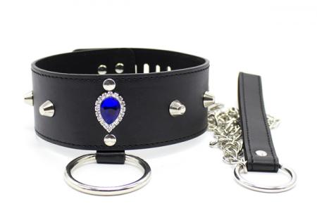 Черный ошейник с украшением и массивным кольцом. Ошейник на регулируемой застежке с замком. В комплекте поводок-цепочка с петелькой.