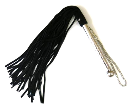 Черная многохвостовая плетка с металлической ручкой. К ручке крепится цепочка на карабине. Отлично подойдет для любителей активных ролевых игр в стиле БДСМ.