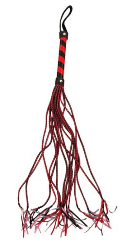 Красная многохвостная плетка для любителей активных ролевых игр в стиле БДСМ. Изготовлена из искусственной кожи.