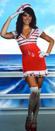 Покоряйте океаны любви в этом ярком костюме морячки. В комплект входят: платье, украшенное серебристыми якорями и красными пайетками, фуражка, перчатки и подвязки.