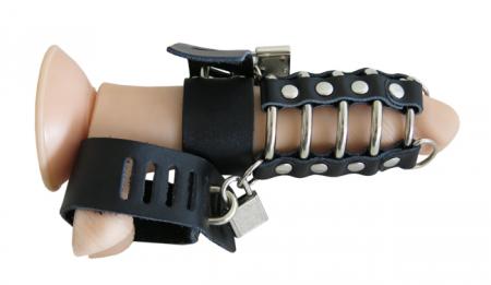 Прекрасно выполненный мужской пояс верности, препятствующий доступу к пенису. Пояс состоит из пяти металлических колец, соединенных между собой и двух ремешков на замке.