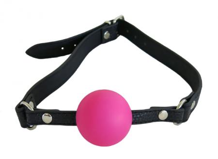 Латексный кляп-шар на регулируемом кожаном ремешке с металлическими заклепками.